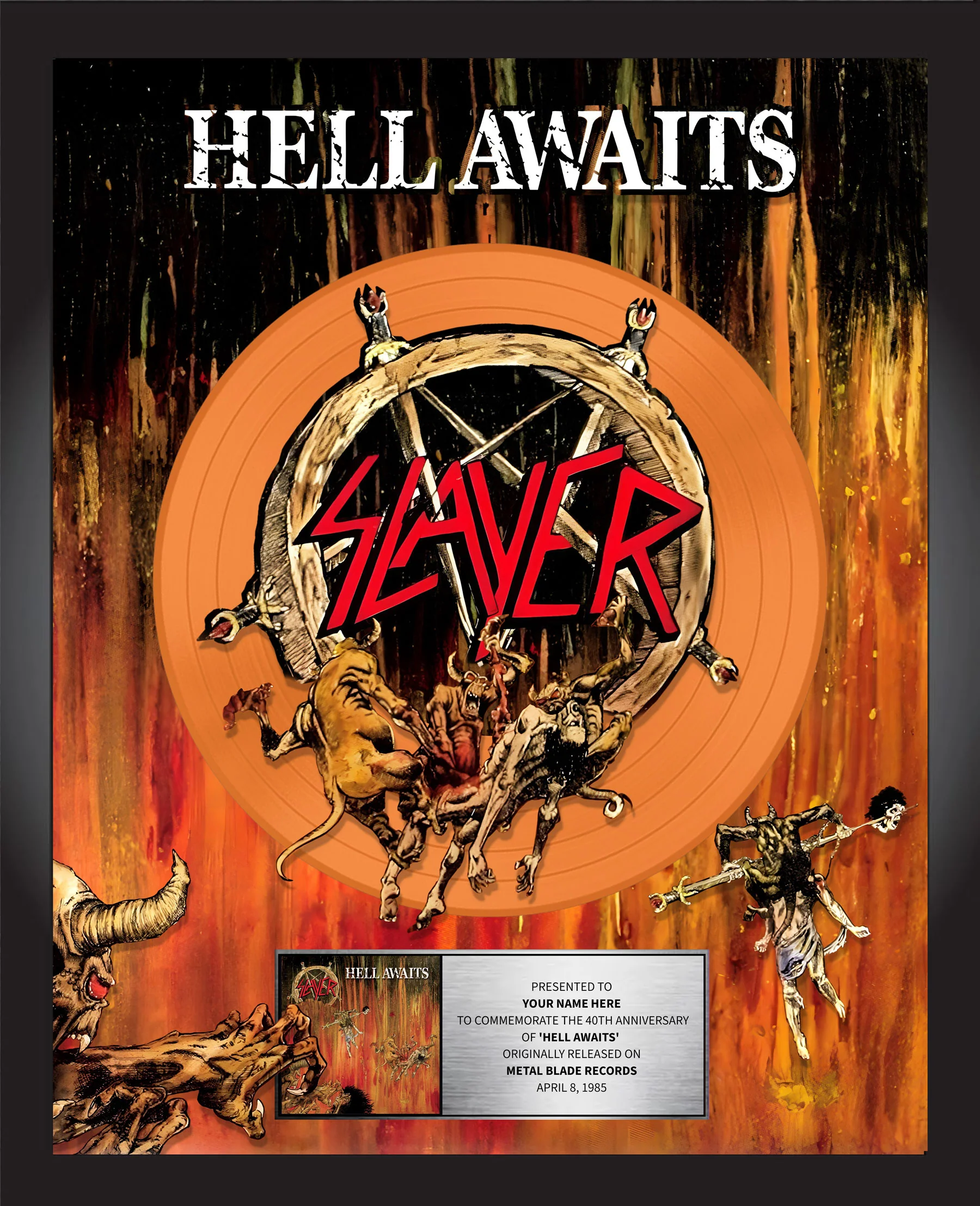This official commemorative plaque marks the 40th anniversary of Hell Awaits, originally released April 8, 1985 on Metal Blade Records.